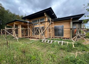 Дом строится из клееного бруса собственного производства из сосны сечением 205х185 мм. Общая площадь дома составляет 426,98 квадратных метров. Это полностью индивидуальный проект нашего заказчика.