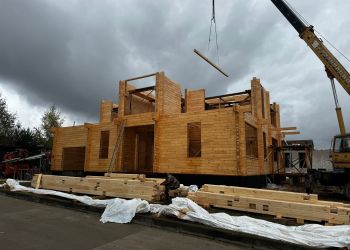 Наша бригада ведет работы по сборке сруба дома. В строительстве мы используем клееный брус собственного производства из сосны сечением 205х270(h) мм. За основу проекта был взят наш типовой проект Турин, но заказчик внес свои индивидуальные изменения. Общая площадь дома составляет 424,61 м2.