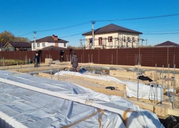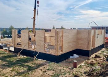 Сейчас наша бригада ведет подготовительные работы для заливки фундамента. Также мы производим заливку плиты дома. Дом будет построен из клееного бруса из сосны сечением 205х270(h) мм. За основу проекта был взят наш типовой проект Турин, но заказчик внес свои индивидуальные изменения. Общая площадь дома составляет 424,61 м2.