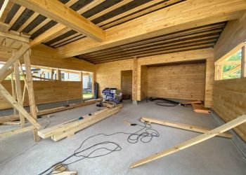 Сейчас мы выполняем чистовую отделку в доме.В строительстве этого дома мы использовали клеёный брус из кедра 205х185 мм.Площадь дома составляет 195 кв.м.