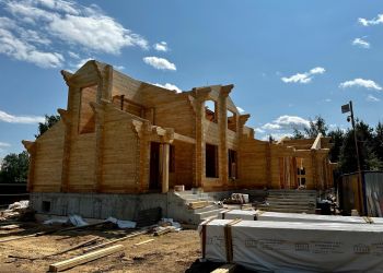 Дом строится по индивидуальному проекту нашего заказчика. Общая площадь составляет 684 квадратных метра.В строительстве мы используем клееный брус собственного производства из сосны и кедра с сечением 245х270мм.