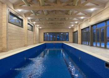 Заполняем водой бассейн.Площадь бассейна составляет более 300 м2. Для строительства использовали клееный брус из сосны и кедра с сечением 245х270 мм.Также в комплексе установлены наши деревянные окна из сосны.