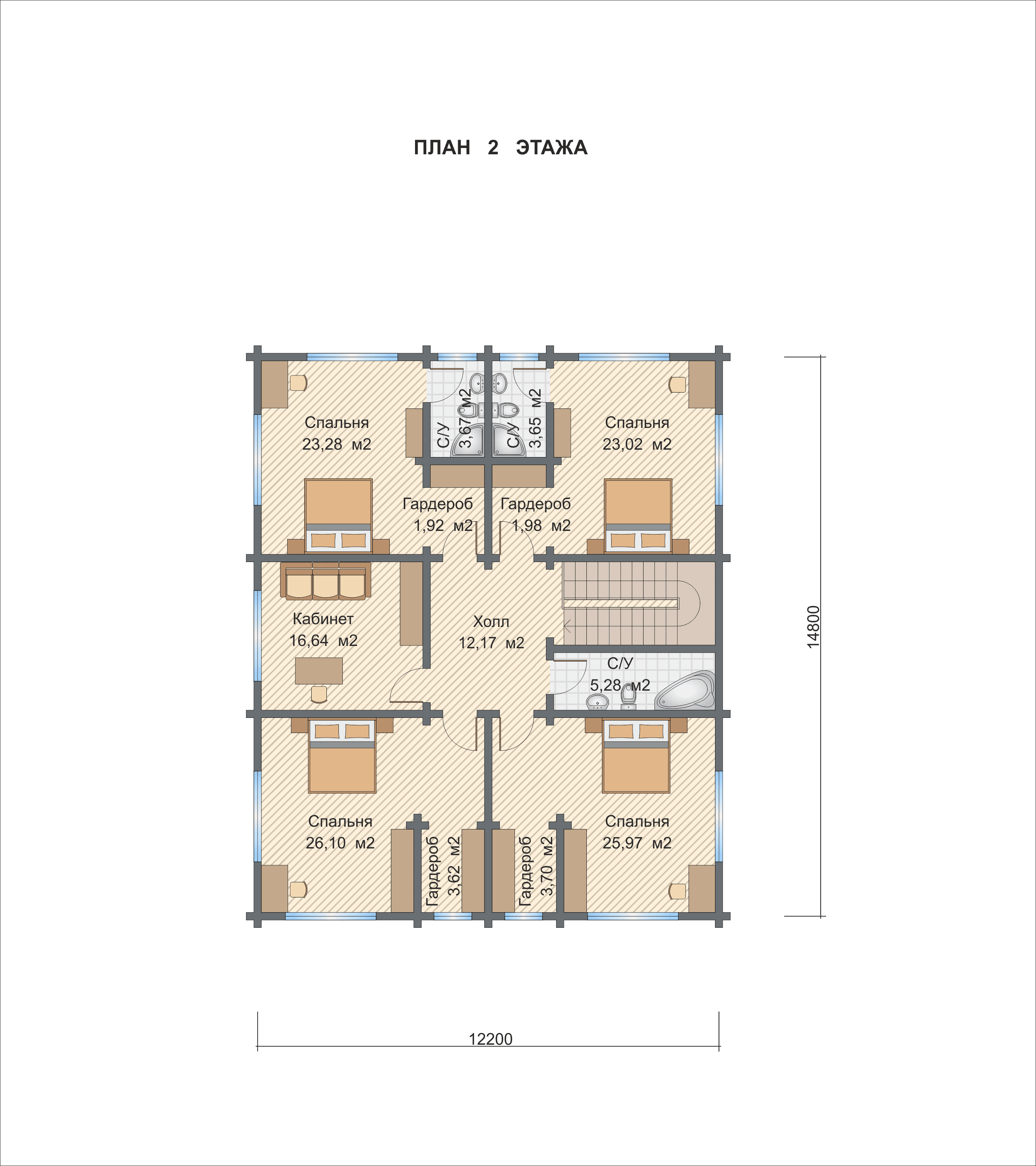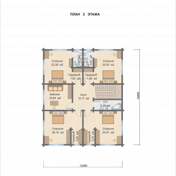 По проекту в здании 4 спальни на втором этаже, в каждой спальне есть небольшой гардероб. Также на втором этаже находится просторный кабинет. Комнаты можно переоборудовать под другие любые необходимые помещения. Дом оборудован пятью санузлами.