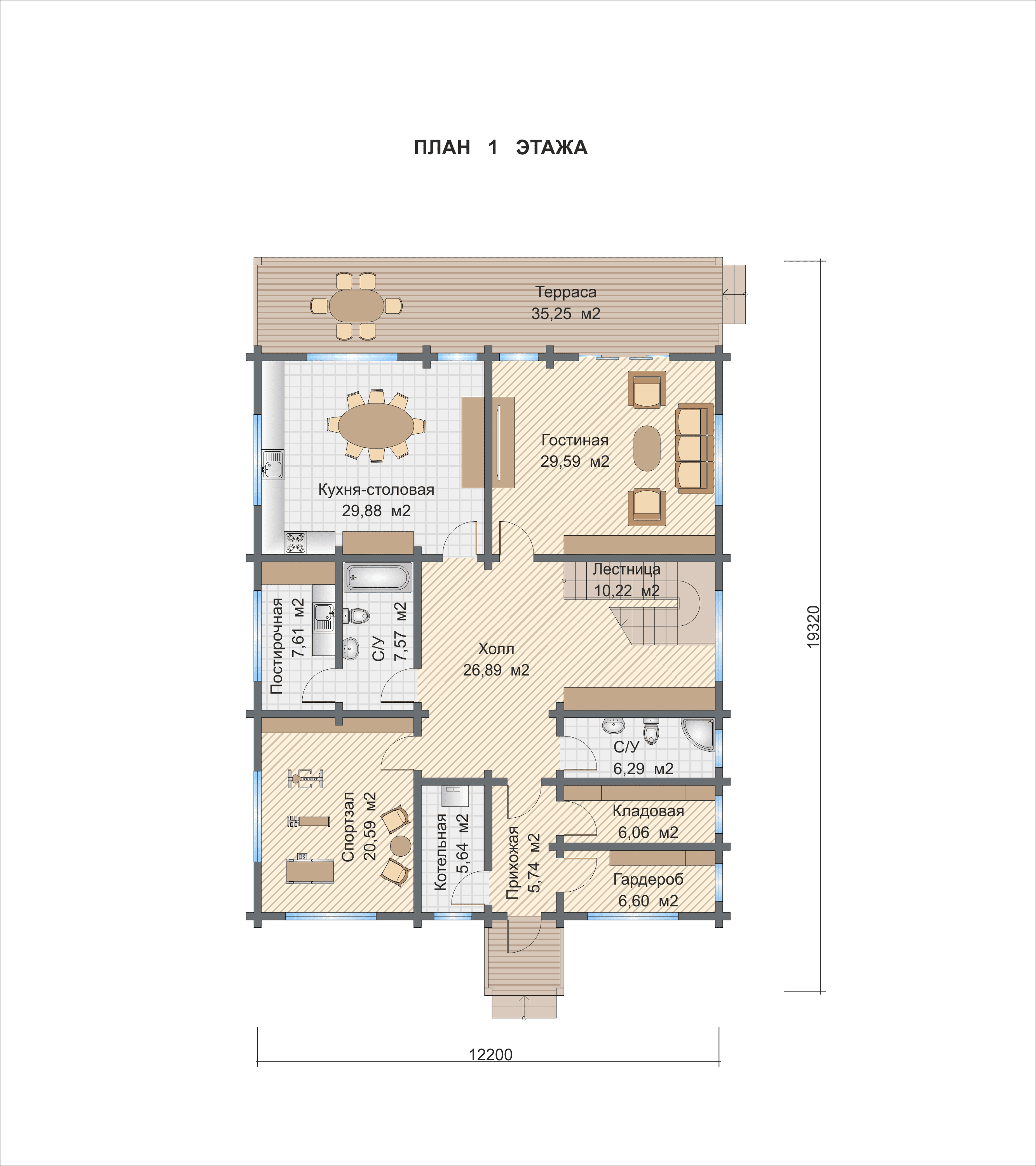 Также, в доме есть большая гостиная, через которую осуществялется выход на террасу и кухней-столовая. На первом этаже расположен спортивный зал и хозяйственые помещения, необходимые для проживания в доме круглый год.